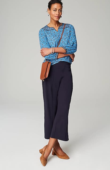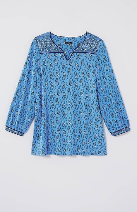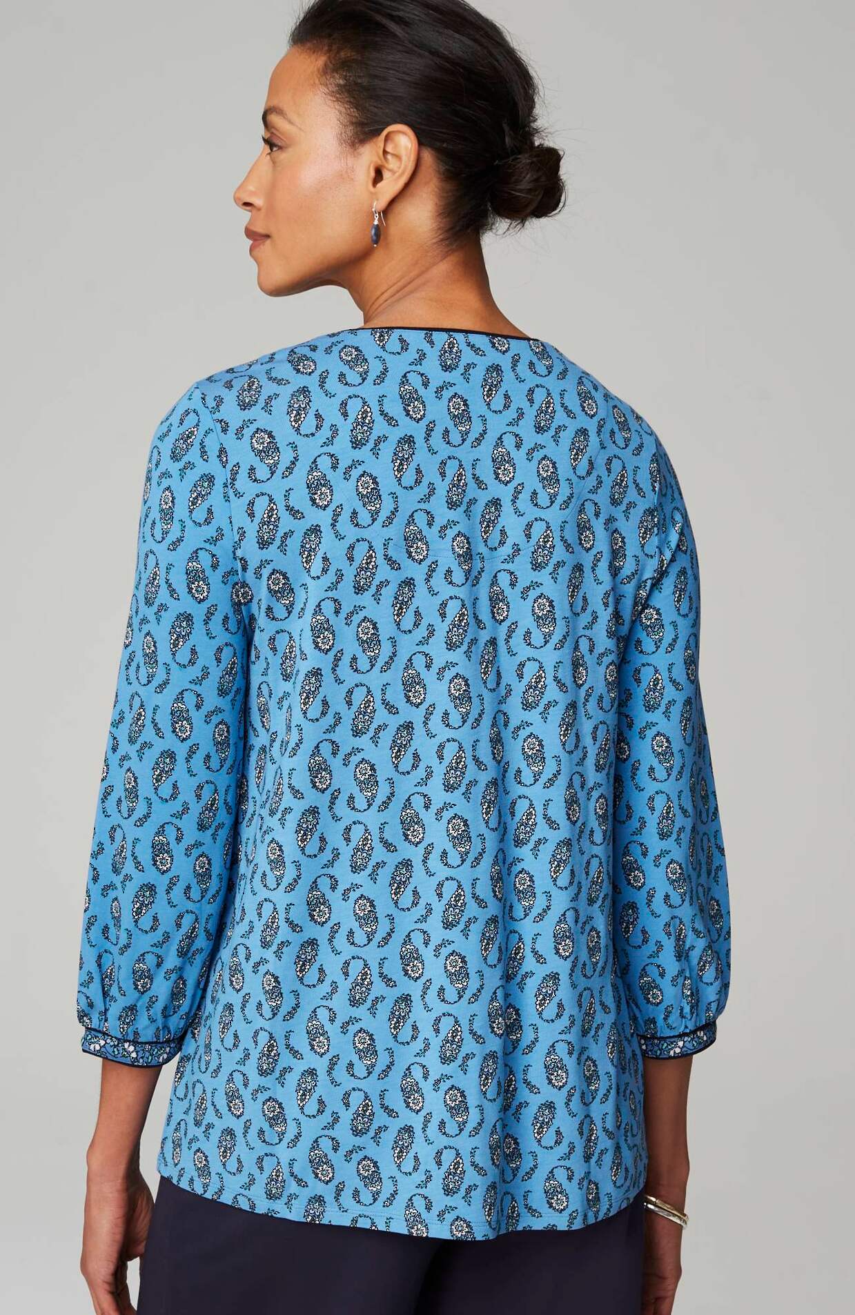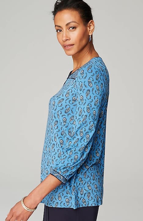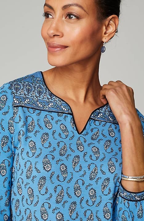 A little detail goes a long way—chic piping defines this peasant-style top, made from the softest European yarns and finished with a contrasting border.