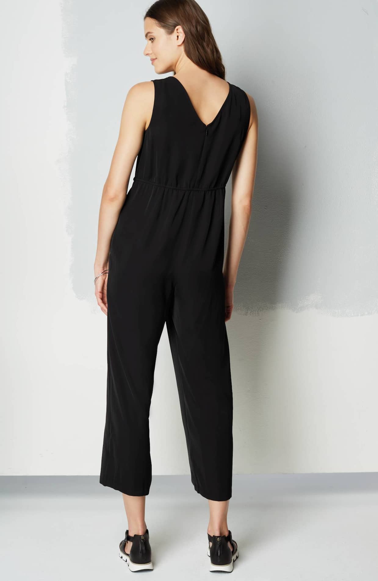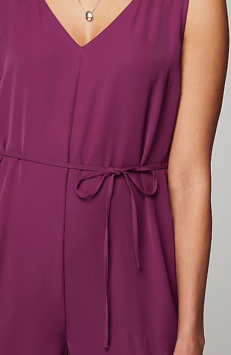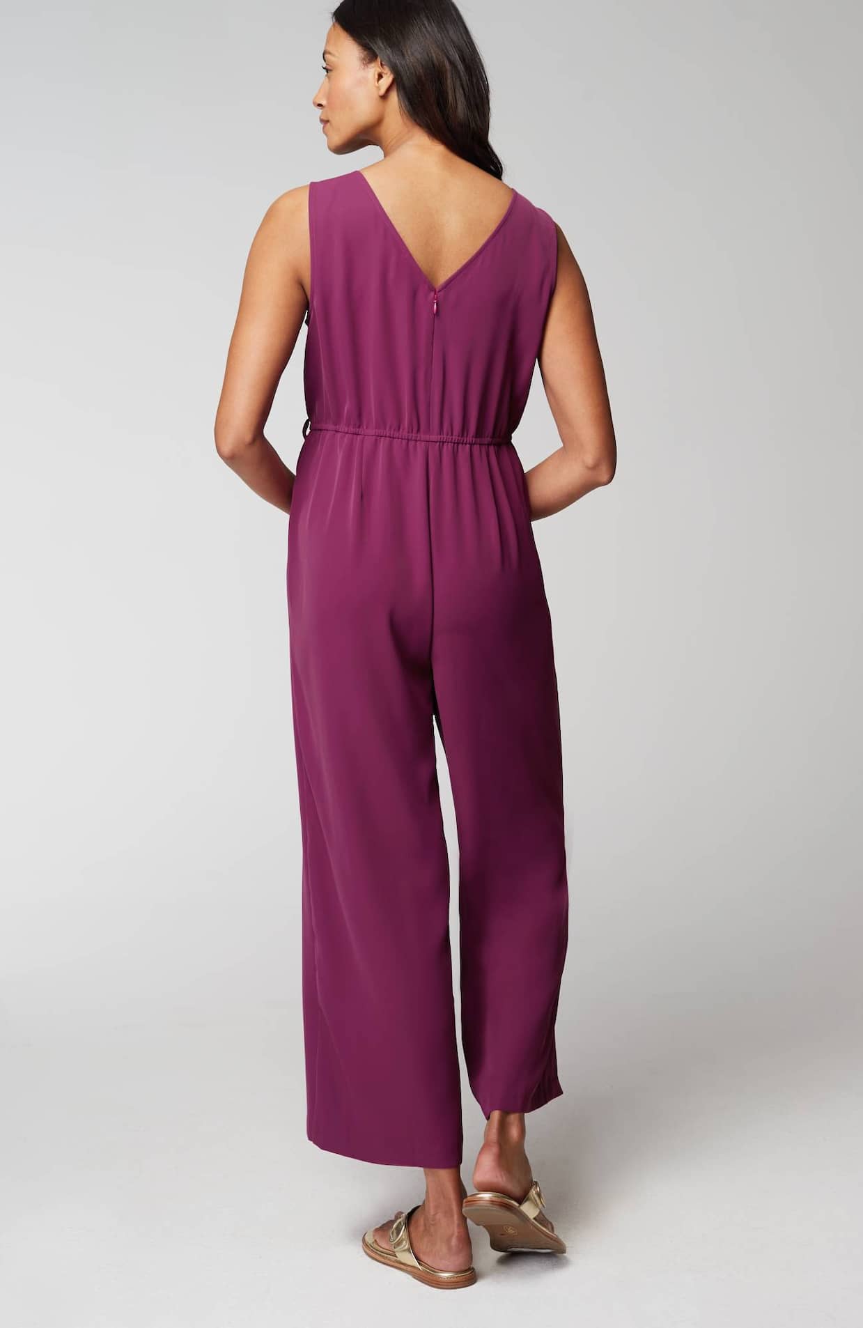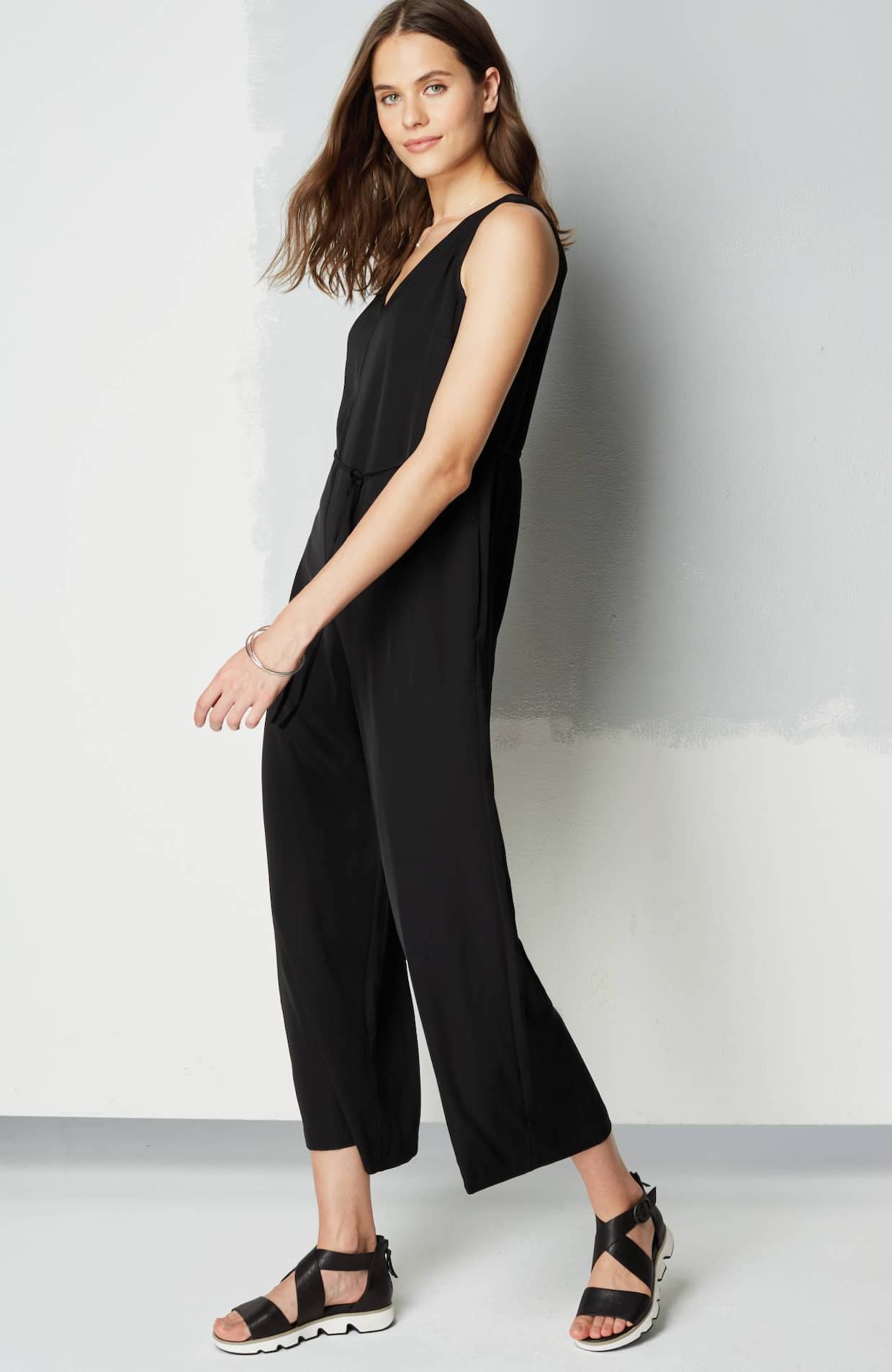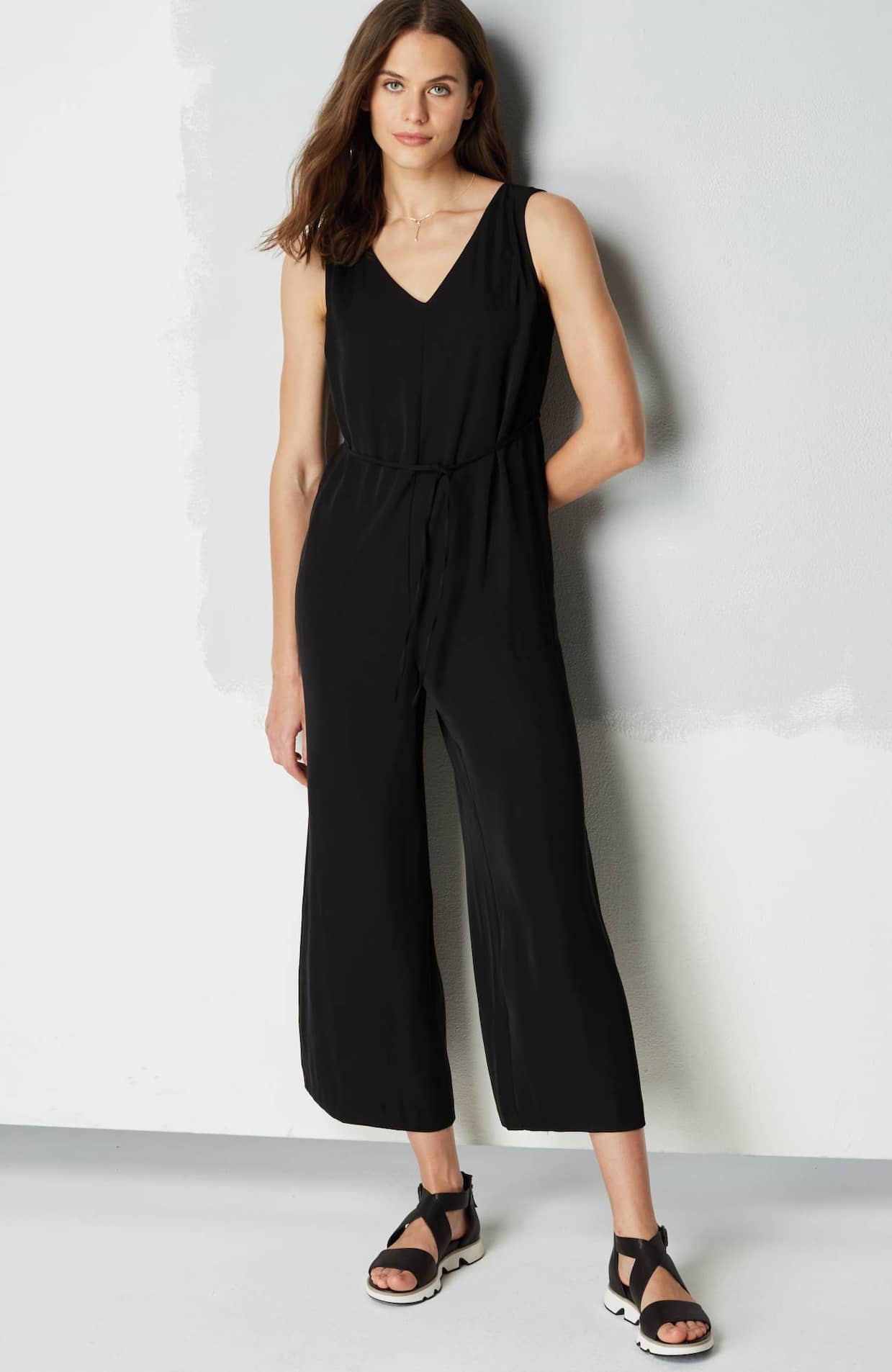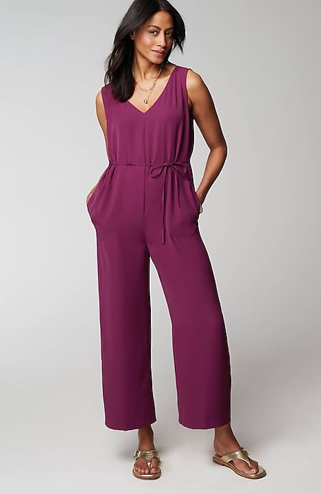 One-and-done dressing takes on a whole new level of comfort with our easy-care twill jumpsuit. You'll love the stylish double-V-neckline, while the cropped length lets you show off summer sandals or sneakers. The self-tie belt with channeled elastic at the back creates a custom flattering fit. On-seam pockets are perfect for holding small essentials. Invisible zipper at the center back. Sleeveless.