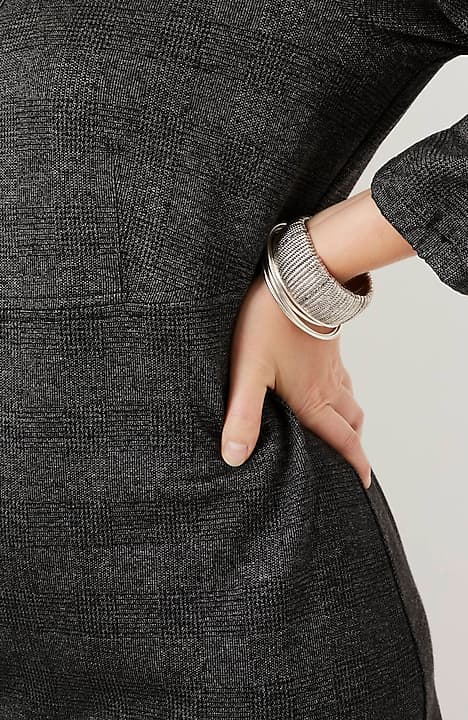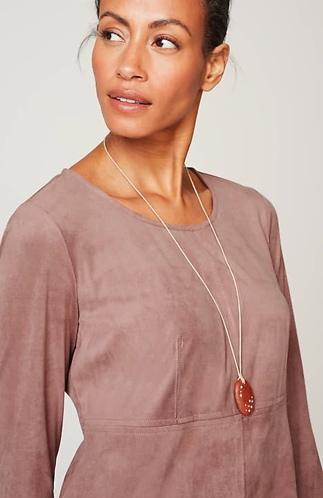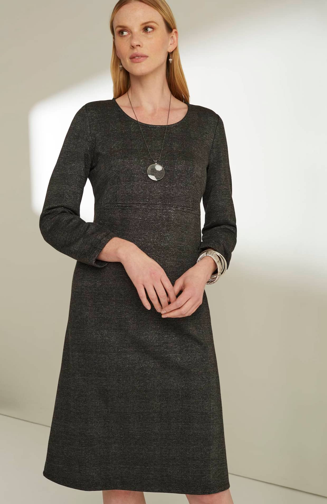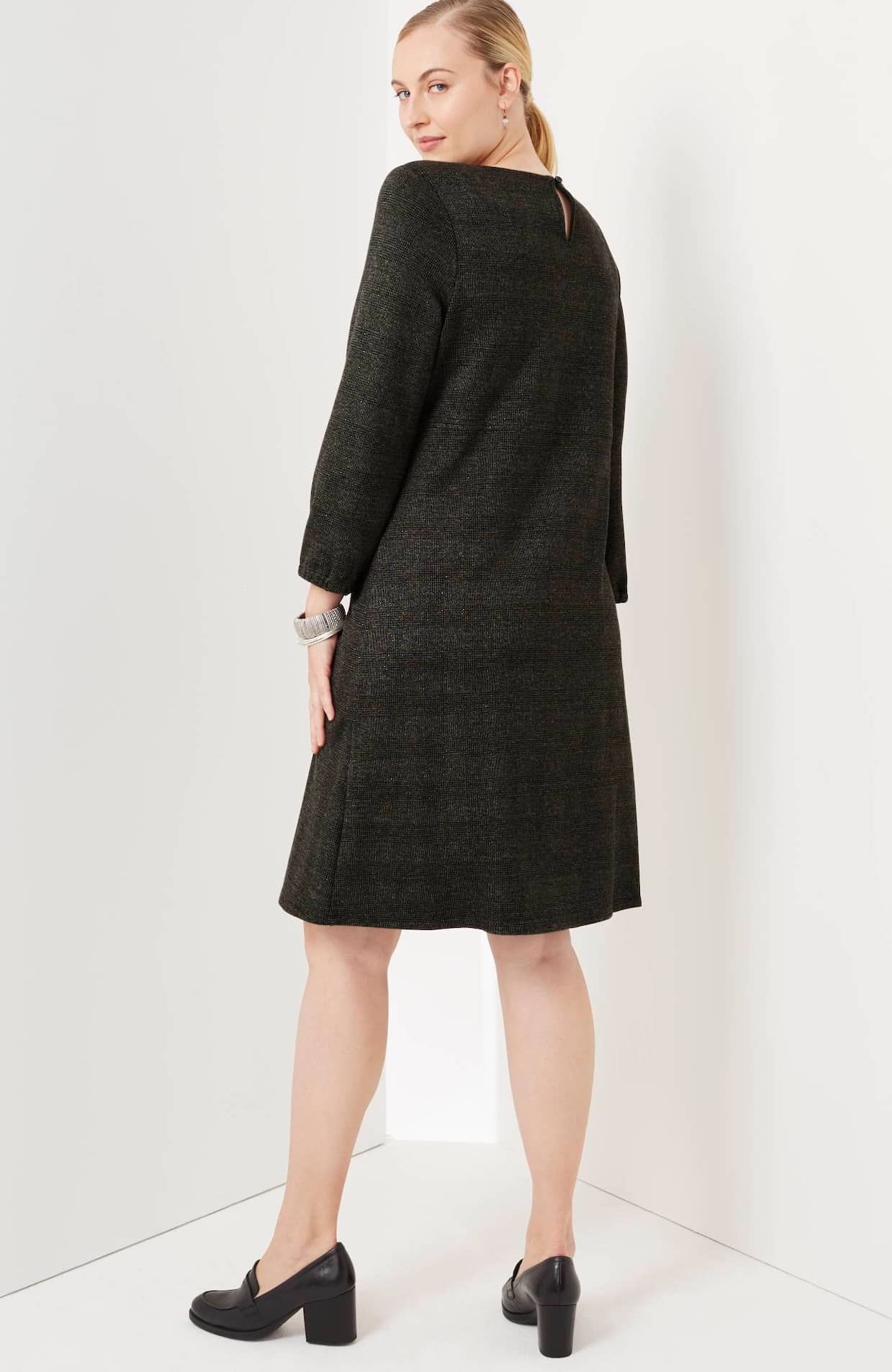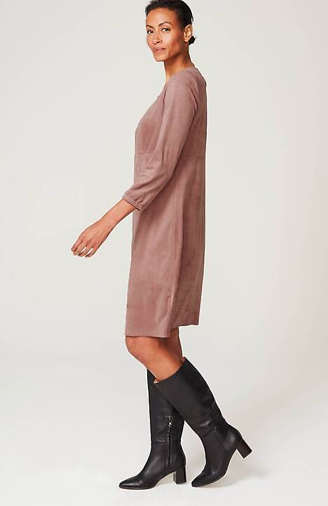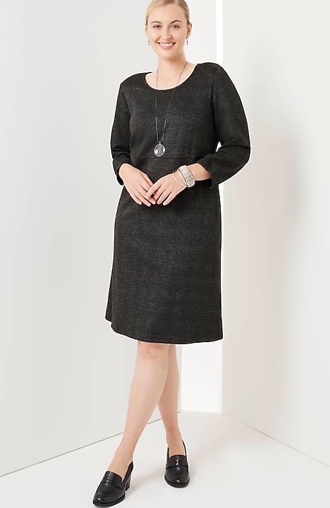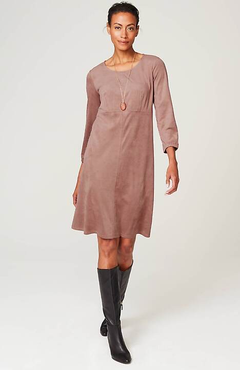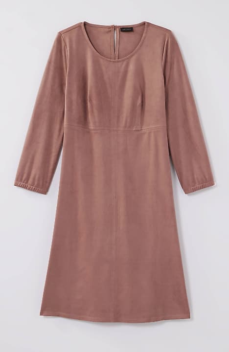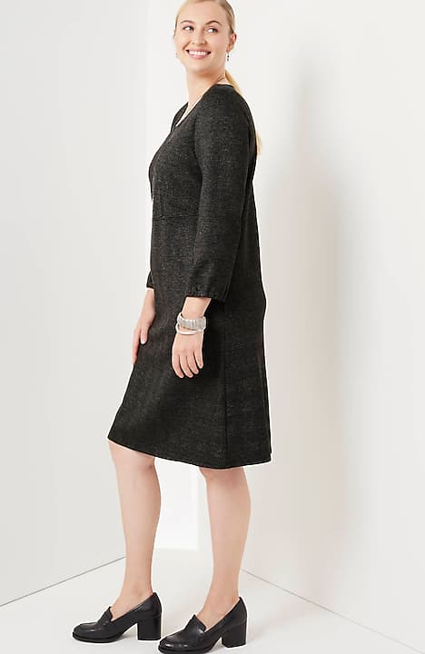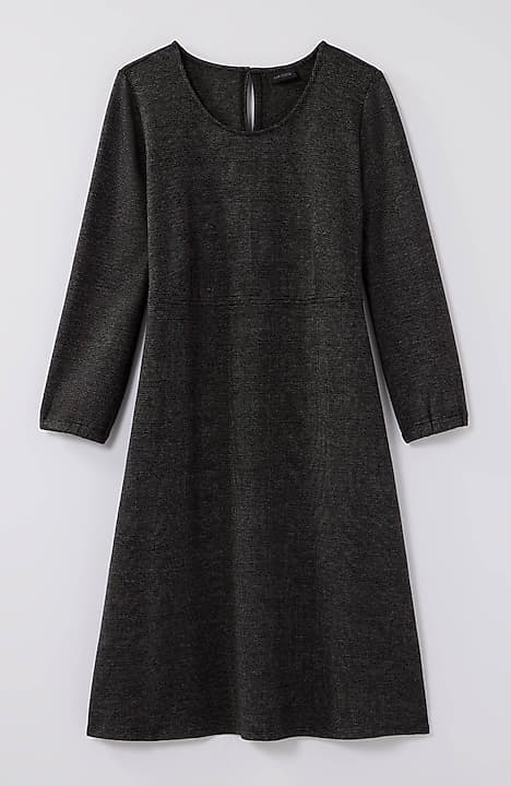 Every closet needs a dress that's ready to go in five. This is that dress. Our favorite factors: an easy A-line, which gives it waist shape and movement, and keyhole accents that add fresh perspective. In two collectible colors: dark charcoal heather/black is a yarn-dyed ponte knit and mauve haze is ultrasoft faux suede knit. Elasticized cuffs.
