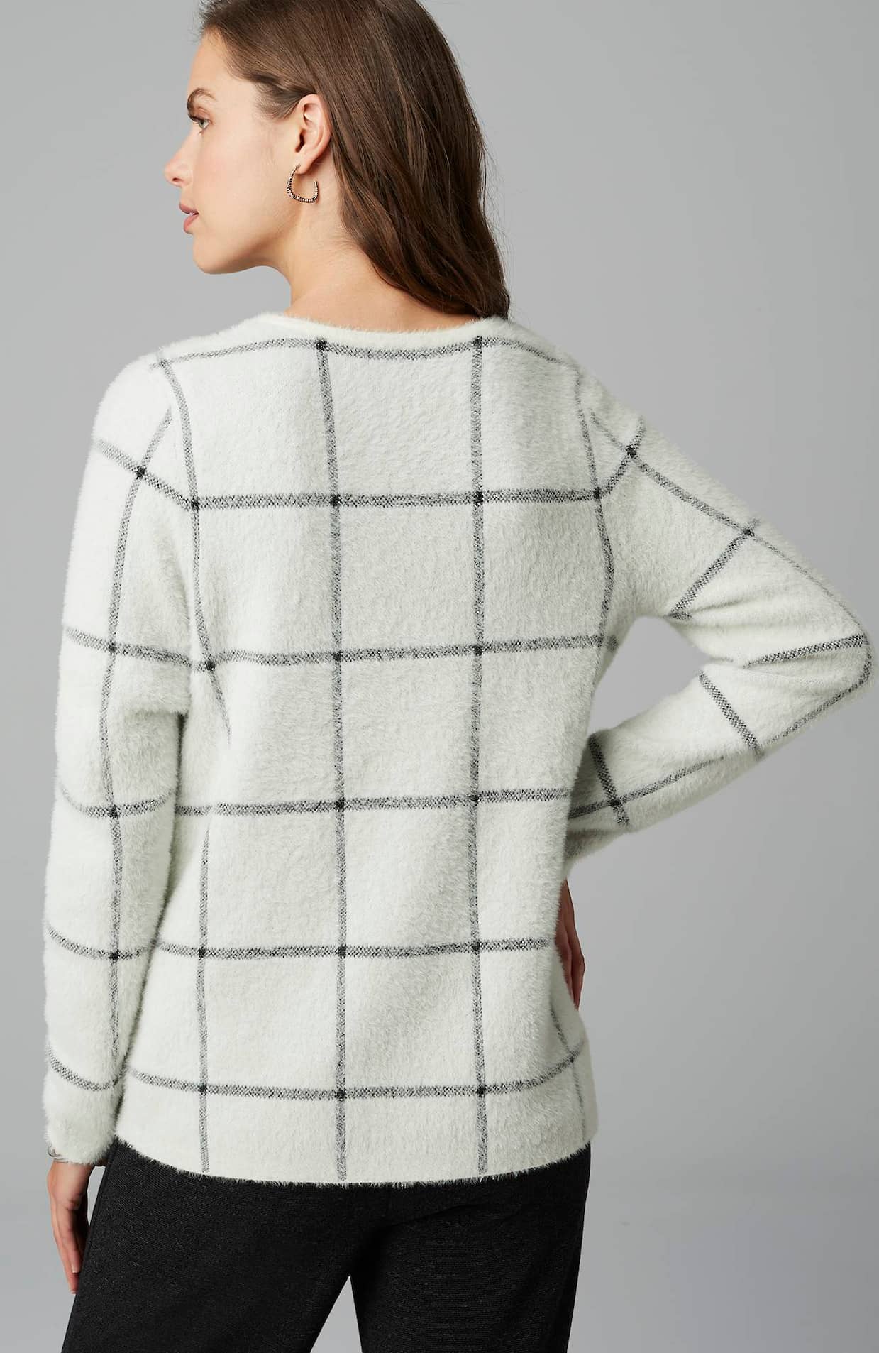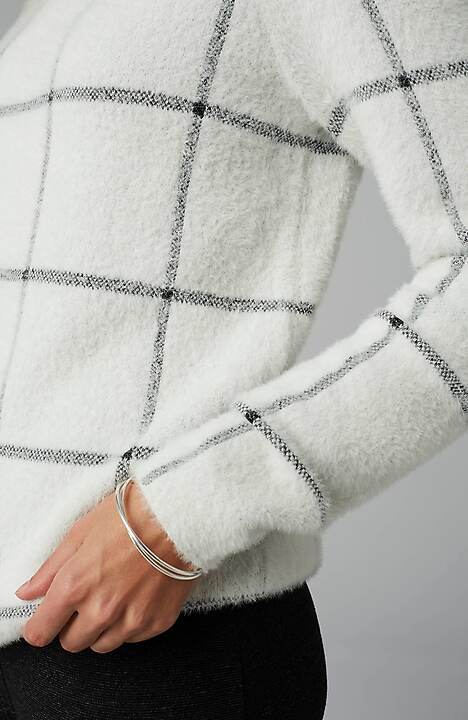 This year's softer-than-ever sweater, with a detachable snood hood, in a refined windowpane jacquard pattern.